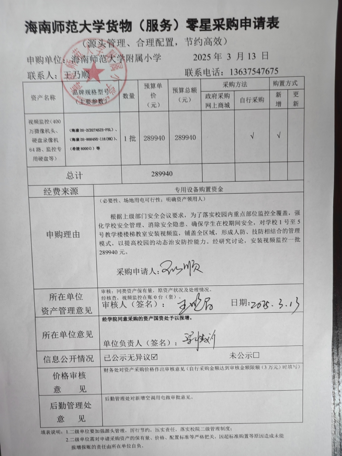 根据上级部门安全会议要求,为了落实校园内重点部位监控全覆盖,强化学校安全管理、消除安全隐患、确保学生在校期间安全,对学校1号至5号教学楼楼梯教室安装视频监,铺盖全区域,形成人防、技防相结合的管理模式,以提高校园的动态治安防控能力。经研究讨论,安装视频监控一批289940元。