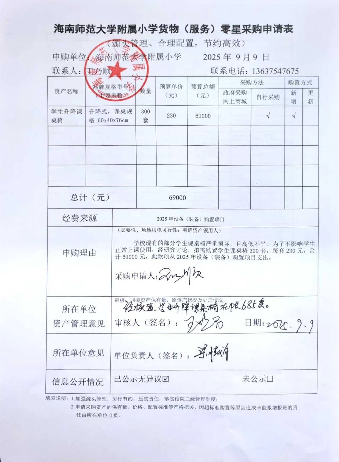 学校现有的部分学生课桌椅严重损坏,且高低不平。为了不影响学生正常上课使用,经研究讨论,拟需购置学生课桌椅300套,每套230元,合计69000元。