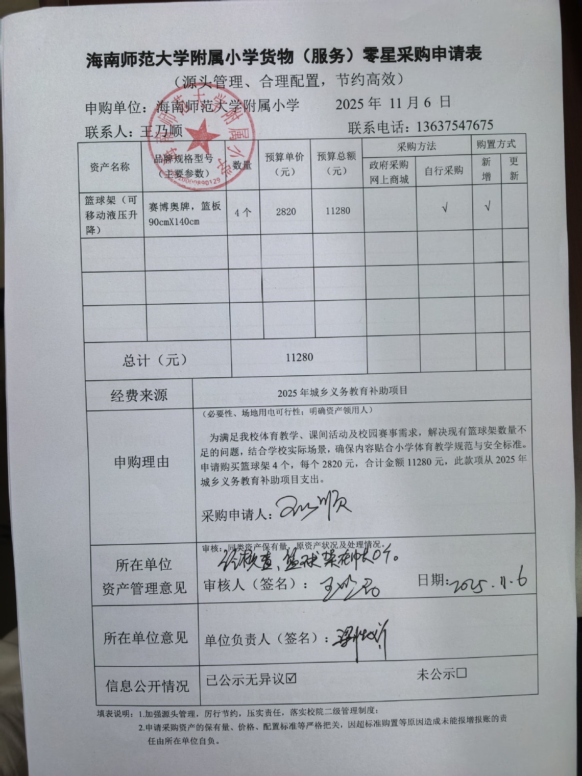 为满足竞彩足球app体育教学、课间活动及校园赛事需求,解决现有篮球架数量不足的问题,结合学校实际场景,确保内容贴合小学体育教学规范与安全标准。申请购买篮球架4个,每个2820元,合计金额11280元。