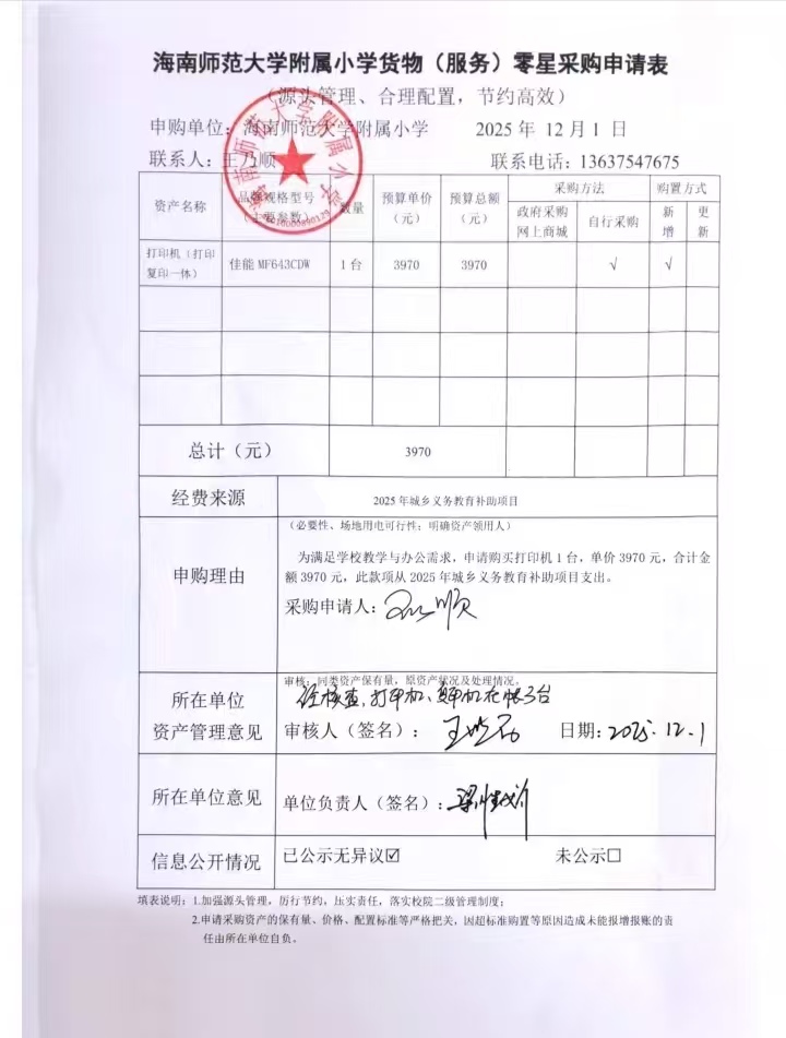 为满足学校教学与办公需求,申请购买打印机1台,单价3970元,合计金额3970元。